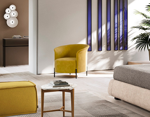 Privlačno mekana i elegantna fotelja za odmor. Sedište stolice ima elastičnu mrežnu strukturu koja podržava poliuretan, pružajući udobnost i izdržljivost. Tajna iza vitkog dizajna i harmoničnih krivina je naslon napravljen od presvučenog i tapaciranog poliuretana hladne pene. Struktura je postavljena na 4 izložene metalne noge sa donjim delom u sjajnoj mesinganoj ili crno-niklovoj završnoj obradi, što stvara elegantan osećaj.
