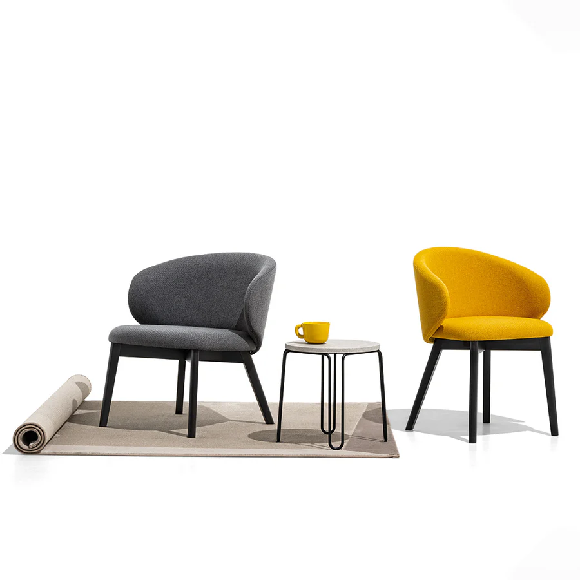 Fotelja TUKA od metalnih cevi. Školjka sa širokim, obuhvatajućim naslonom i zaobljenim sedištem, dostupna u 100% recikliranom polipropilenu ili tapacirana i jastučasta.