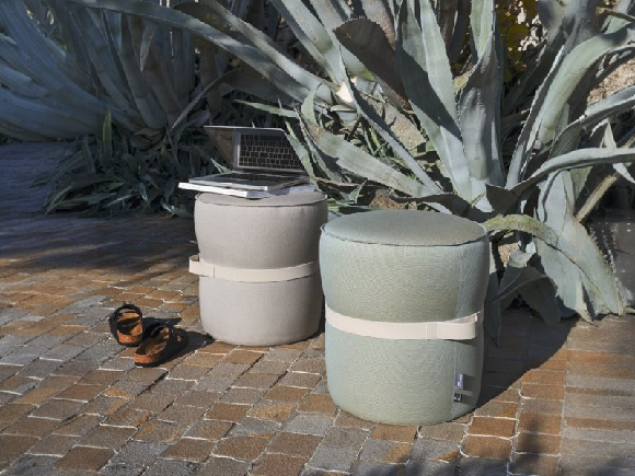 Potpuno podstavljeni i tapacirani okrugli puf sa stegnutim šavovima oko ivice sedišta. Dekorativna gumena traka za ručku.