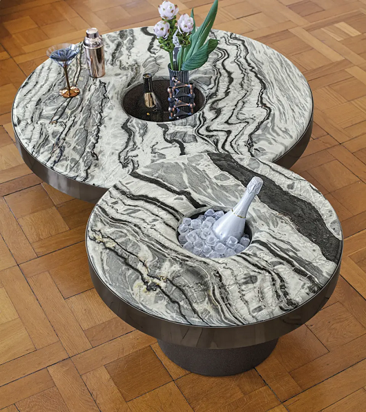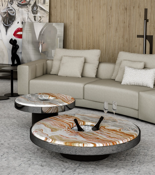 Aperitivo klub sto ima elegantan I prefinjen dizajn,zahvaljujući okrugloj ploči od finog mermera I udobnom centralnom postolju. Dodatak dnevnoj sobi koji može postati vrhunac svakog okruženja.