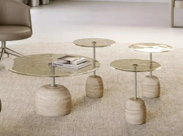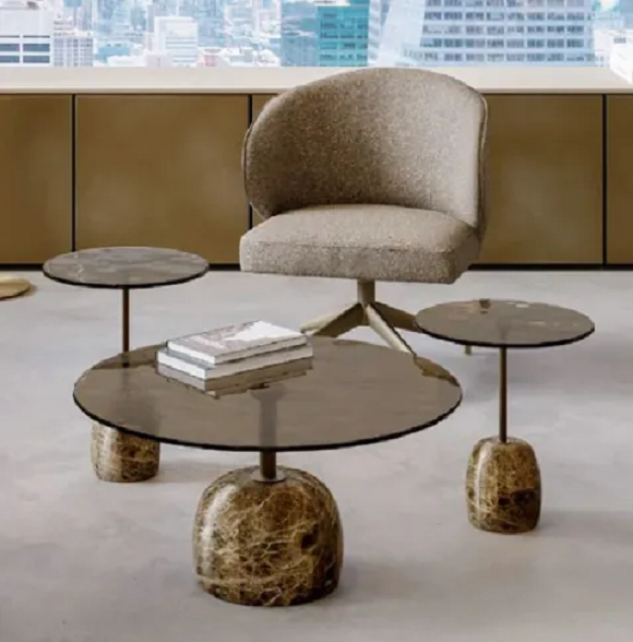 Klub stočić „Sir“ je skulpturalni centralni element koji transformiše svaki životni prostor u galeriju prefinjenog ukusa. Njegova smela silueta kombinuje zaobljenu čvrstu mermernu osnovu sa svetlećim vrhom od spojenog stakla, spojenim elegantnim nosačem od obojenog metala. Ova interakcija tekstura i materijala stvara dinamičan vizuelni iskaz koji obuhvata modernu estetiku. Bilo da je stilizovan solo ili u ugnežđenom aranžmanu, „Sir“ donosi ravnotežu, eleganciju i nepogrešivu klasu svakom savremenom prostoru.