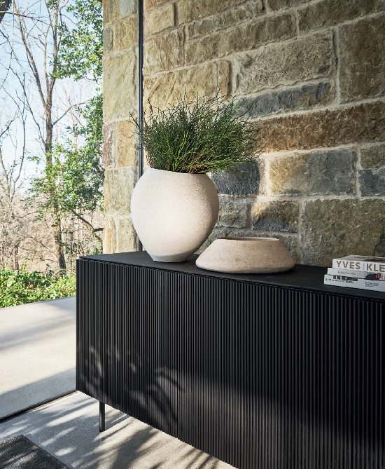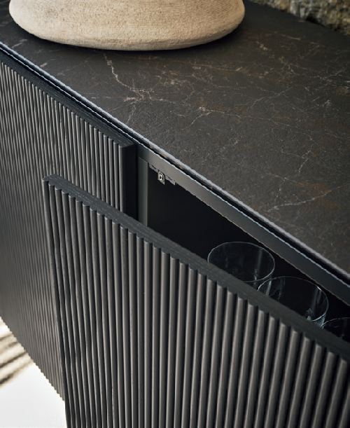 Vertikalna vrata imaju motiv kanelova u dve opcije završne obrade. Staklo, tradicionalno i elegantno, oživljava klasični komod sa savremenim preokretom. Drvo, toplo i sofisticirano, poboljšava materijal, donoseći novu taktilnu dimenziju životnom prostoru.