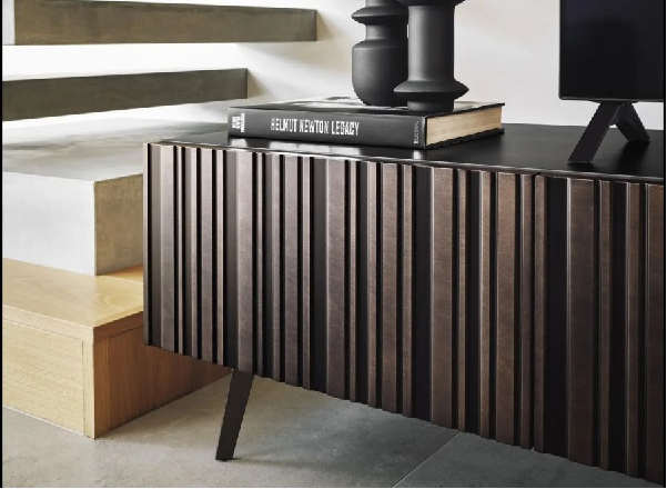 Vrata Stripes imaju uzorak nepravilnih vertikalnih traka. Završna obrada od brušene bronze stvara interakciju volumena i dubine koja ističe estetiku komode, čineći je centralnim delom u dnevnom boravku.