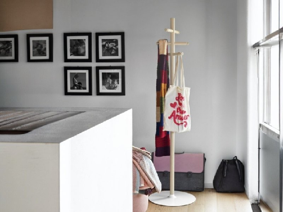 Čiviluk za kapute sa teškim postoljem, metalnim stubom i kukama od bukovog drveta.