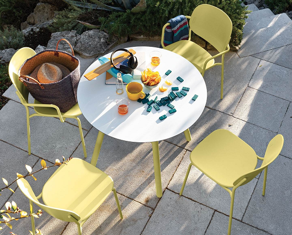 YO! To je savršena stolica za ručavanje na otvorenom sa prijateljima. Ima obrađen i ofarban metalni ram od cevi za upotrebu na otvorenom. Izaberite svoje sedište i naslon: polipropilen sa dekorativnom pločom za pričvršćivanje koja odgovara ramu ili tkani na aluminijumskom ramu. Ravna pletenica povećava udobnost i ojačana je polipropilenom, što poboljšava njenu izdržljivost na otvorenom. Verzija sa polipropilenskim sedištem i naslonom se slaže u visinu od 4 reda.