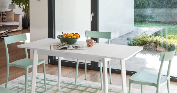Rastegljivi drveni sto DINE sa blago zaobljenim nogama i lakiranim okvirom. Ploča je napravljena od laminiranog drveta sa ravnom ivicom i zaobljenim uglovima. Centralni sklopivi produžetak se slaže sa pločom. Njegovi jednostavni oblici i osnovni materijali čine ga savršenim za ljubitelje skandinavskog stila.