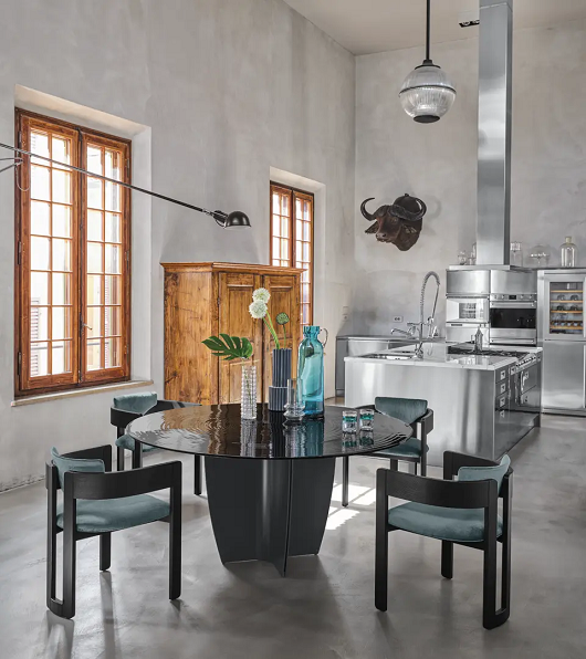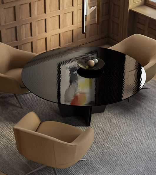 Sto Gambler kompanije Arketipo Firenze pokazuje dizajn koji kombinuje modernost i prefinjenost, zahvaljujući elegantnoj ploči od tamnog stakla sa prugastom površinom koja stvara jedinstvenu igru svetlosti. Postolje je dostupno u obojenom metalu.