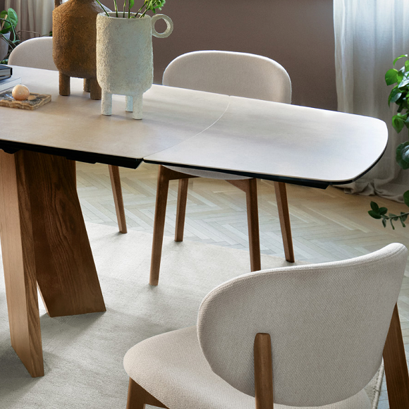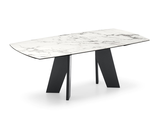 Viktor sto se ističe po svojoj osnovi, sa dva nosača od obojenog jasena, koji stvaraju prepoznatljiv grafički potpis i daju dinamičnost i vizuelni zamah celom dizajnu. Rafinirana i izdržljiva keramička ploča se harmonično integriše sa osnovom, pojačavajući kontrast između materijala. Ravnoteža između čvrstine i lakoće čini ovaj sto upečatljivim komadom, sposobnim da ulepša svaki prostor svojom elegancijom.