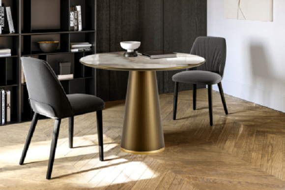 Ted Bistro sa mermernom pločom je sto koji kombinuje savremeni stil sa tradicionalnim oblikom bistro stola. Dizajner Nelo Palomba je ovaj okrugli sto zamislio kao moderan komad nameštaja, sa gornjom osnovom i donjim prstenom od dvobojnog ili jednobojnog obojenog metala, dok je vrh od mermera sa kosim ivicama debljine 20 mm. Nepogrešiv dodir koji daje dragoceni mermer čini ovaj bistro sto savršenim za okruženja tamnih boja, gde se kontrast više ističe, definišući klasičan kontrast.