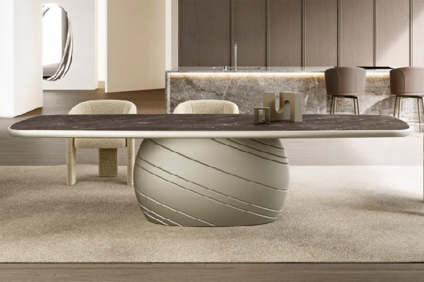 Trpezarijski sto Giove crpi inspiraciju iz nebeskih oblika i astrološke simbolike. Njegova skulpturalna baza i čiste linije odražavaju eleganciju planetarnog kretanja, sa fokusom na harmoniju i prisustvo. Sa strane, ovalni postolje deluje gotovo cilindrično, njegova površina detaljno je ispunjena uglovima, udubljenim linijama koje kao da se suptilno menjaju sa svetlošću i perspektivom. Rezultat je upečatljiv centralni deo koji deluje istovremeno prizemljeno i eterično.