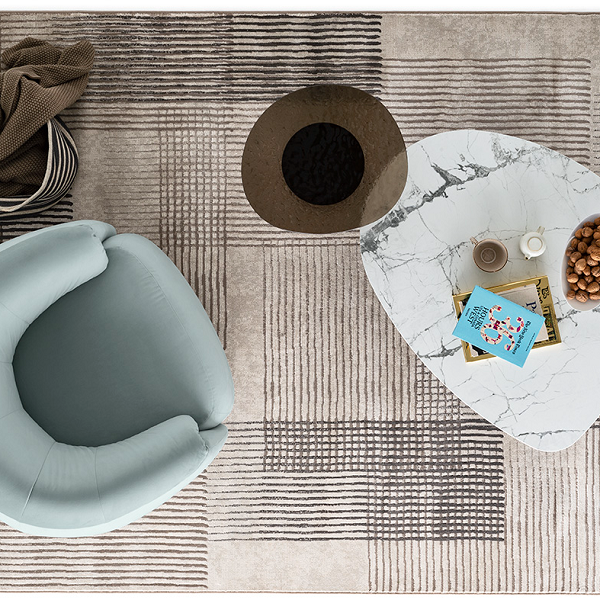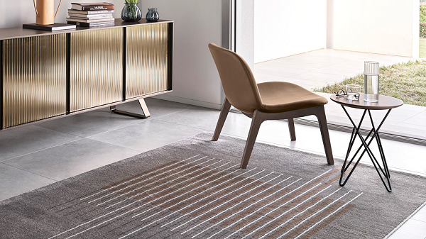 Tepih poput rama za slike koji daje savremeni zaokret racionalističkim slikama dvadesetog veka. Oštar kontrast između duvansko smeđe i pepeljasto sive boje jasno ocrtava smelu, strogu ličnost, ali takođe govori o elegantnom estetskom izgledu koji je pogodan i za prostore ispunjene svetlošću i za prijatne intimne atmosfere. Aptaun je mašinski napravljen, a i flis i struktura su napravljeni od sintetičkih vlakana (poliester i polipropilen), ali sa posebnom ultra-otpornom obradom koja daje efekat „ručne izrade“.
